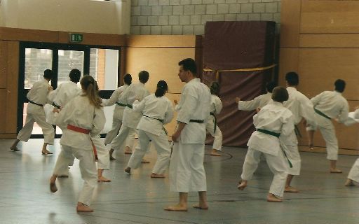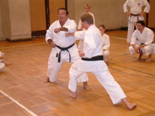 Dann in der zweiten Trainingseinheit (jetzt waren die Fortgeschrittenen dran) legte Sensei Namiki los: Es wurde das gesamte Grundschulprogramm für die Shodan-Prüfung absolviert und auch noch Teile des Kumite-Programms. Da einige Übungen sehr schwierig waren, differenzierte Sensei Namiki, d.h. die Blaugurte brauchten die eine oder andere Übung nicht vollständig absolvieren. Die Übungen waren so anstrengend und schweißtreibend, daß alle froh waren, als diese Trainingseinheit endlich vorüber war. Ich glaube, alle haben sich wirklich Mühe gegeben und verausgabt. Nicht zuletzt wegen Sensei Namiki’s berühmten Satz, den er bei den Fortgeschrittenen auch in dieser Trainingseinheit einsetzte: „No spirit, no Kiai – push up!“