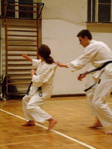 Der Sonntag beinhaltete dann noch eine Überraschung für alle Teilnehmer. Zunächst war eine Trainingseinheit für alle Teilnehmer zusammen angesetzt. Kurz vor Trainingsbeginn kam Sensei Namiki in die Halle und übernahm gleich selbst die Aufwärmarbeit. Gemeinsames Joggen quer durch die ganze Halle – das macht echt Spaß vor allem weil auch Sensei Namiki selbst mitmachte und hin wieder einen Scherz einbaute. Danach kurz Mokuso und dann ging es los: Kata war angesagt. Heute teilte Sensei Namiki die Karateka in vier Gruppen, die von jeweils verschiedenen Schwarzgurten übernommen wurden. Sensei Namiki selbst übernahm die Braun- und Schwarzgurte. Hier sollten alle wichtigen Shotokan Kata angefangen von den fünf Heian Kata über Tekki, Kanku Dai, Enpi, Jion bis Hangetsu geübt werden. Allerdings verkündete Sensei Namiki gleich zu Beginn eine kleine Zusatzaufgabe: Für jeden Fehler bei der Ausführung der Kata gibt es 20 Liegestütze! Gesagt getan – Dirk übersetzte diese kleine Sache noch schnell für die anwesenden polnischen Schwarzgurte und schon ging es los: Heian Shodan – und prompt der erste Fehler: Auf dem Rückweg statt Oi Zuki – Age Uke. „Yame!“ – schallte Sensei Namiki’s Stimme durch die Halle – „Push up!“ Die ersten zwanzig waren fällig. Dirk machte noch eine Geste wie „Ich erschieße Dich für diesen Fehler.“ Doch schon kurze Zeit später verlief er sich selbst in der nächsten Kata. Nach ca. 120 Liegestützen waren die Heian Kata endlich geschafft und es ging mit Tekki Shodan weiter.
