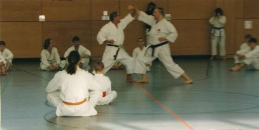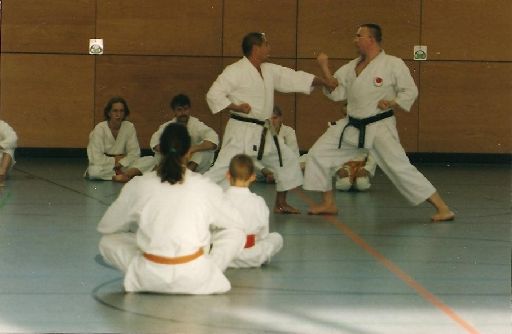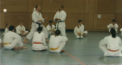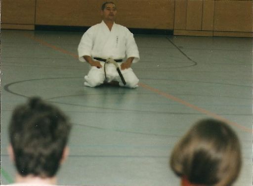 Doch dann war der Punkt erreicht, an dem auch Sensei Namiki die vielen Liegestütze zuviel zu werden schienen. Einige Schwarzgurte hatten auch bereits schon angefangen sich gegen diese Trainingsmethode „Liegestütz“ aufzulehnen. Äußerungen wie „Das ist doch kein richtiges Training mehr.“ waren zu vernehmen. Dann begann Dirk Leiding Sensei Namiki zu erklären, daß die Braungurte die Kata Kanku Dai noch nicht kennen würden. Sensei Namiki blickte ungläubig in die Runde und fragte sicherheitshalber noch einmal nach. Dirk erklärte dann noch einmal auf deutsch und fragte die anwesenden Braungurte: „Ihr kennt doch die Kata Kanku Dai noch nicht, ihr seid diese Kata doch noch nie gelaufen…!?“ und schüttelte dazu den Kopf, so daß auch der letzte wissen mußte, wie er zu antworten hatte.