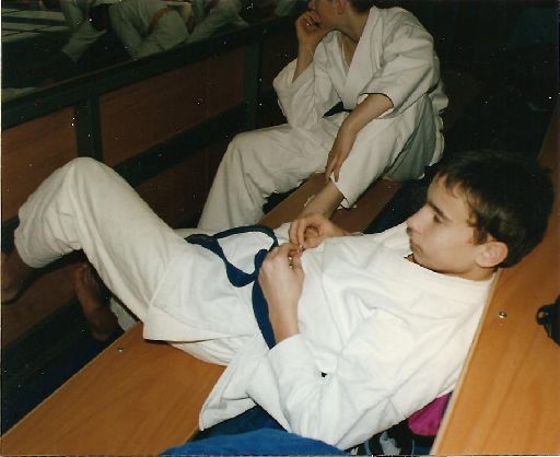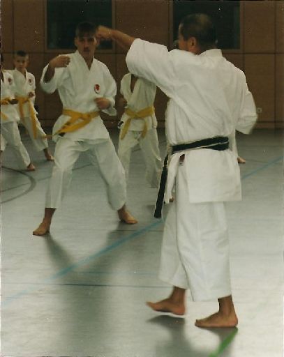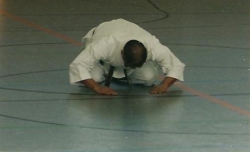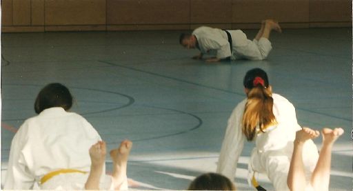 Kanku Dai aber setzte dem ganzen den Gipfel auf: Allein die Anfangsbewegung der Kata brachte uns rund 80 Liegestütze ein, da Sensei Namiki aufs genaueste auf die Fingerhaltung achtete. Sensei Namiki schien sich anfangs über jeden Fehler zu freuen. Hatte er einen entdeckt hörte man von ihm ein fröhliches Lachen gefolgt von einem lauten „Yame!“ und schon wußten alle, was auf sie wartete. Nach der Vielzahl der bisher ausgeführten Liegestütze machte es aber den Teilnehmern schon langsam keinen Spaß mehr, obgleich Sensei Namiki diese mit dem Hinweis aufzulockern versuchte, daß auch er mitmachte. Sensei Namiki stand an die Wand gestützt und beugte leicht seine Arme im Rhythmus der Liegestütze ein, machte schließlich ebenfalls an der Wand Liegestütz auf nur einem Finger, seitwärts, rückwärts – alles eigentlich sehr lustig, dazumal er auch noch stöhnte, als ob er es nicht mehr schaffen würde.