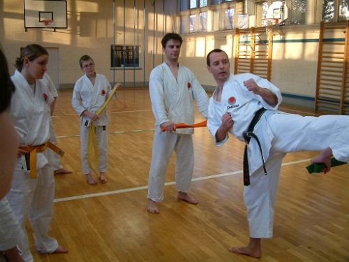 Nach dem gemeinsamen Mittagessen im China-Restaurant ging es zurück in die Halle zur nächsten Trainingseinheit. Für den Nachmittag war ein „Special“-Training für alle Lehrgangsteilnehmer geplant, welches Siggi als Selbstverteidigungstraining basierend auf grundlegendsten Karate-Techniken gestaltete. Er griff hier Techniken heraus und ließ diese üben. Dieses eigentlich für 30 Minuten geplante Training kam bei allen so gut an, dass daraus letztlich eine Stunde wurde und den ganzen Zeitplan durcheinander brachte.