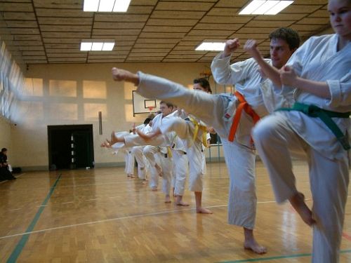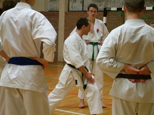 Das Training der Fortgeschrittenen konnte wegen des nun gänzlich durcheinander geratenen Zeitplans erst um 18 Uhr beginnen. (Zu diesem Zeitpunkt hätte es eigentlich enden sollen). Siggi ließ Gohon Kumite mit verschiedenen Angriffen und Abwehren sowie freien Angriffen und Abwehrtechniken üben, was auch die Braungurte manchmal in Verlegenheit brachte. Eine äußerst gute Übungsmethode! Zum Abschluss übten wir dann noch die erste Hälfte der Kata Bassai Dai. Aus Zeitmangel mussten wir dann hier abbrechen.