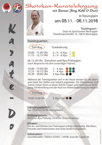 Vom 05.11. – 06.11.2016 findet ein Karate Lehrgang mit Sensei Jörg Kohl (7. Dan) in Neuruppin statt. Allen Interessenten unseres Vereins bitte ich um zeitnahe Rückmeldung damit wir die Mitfahrgelegenheiten planen können. Training für Weiß bis Schwarzgurte.