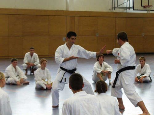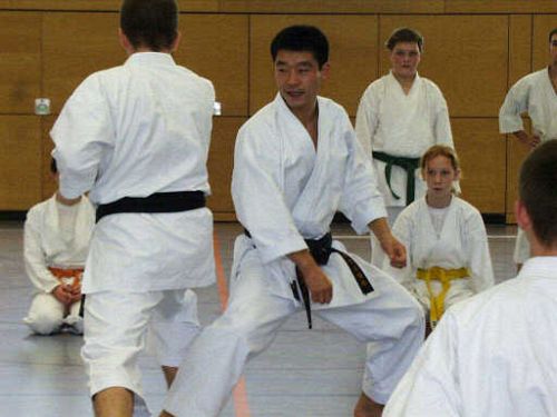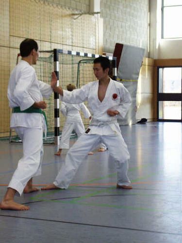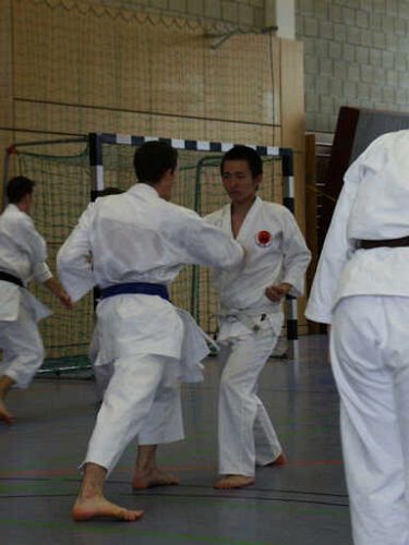 Wie gewohnt begann Ohta Sensei ganz vorn. Zunächst einführende Grundtechniken, dann Kihon und schließlich Partnerübung. Am Samstag wurde im Anfängerbereich zunächst Kihon Ippon Kumite geübt. Neben einfachen Abwehrtechniken ging Ohta Sensei auch schnell dazu über sowohl Block- als auch Gegentechnik auf ein höheres Niveau zu setzen. So wurde dann beispielsweise mit Shuto Uke geblockt und mit dem hinteren Bein mit Mae Geri