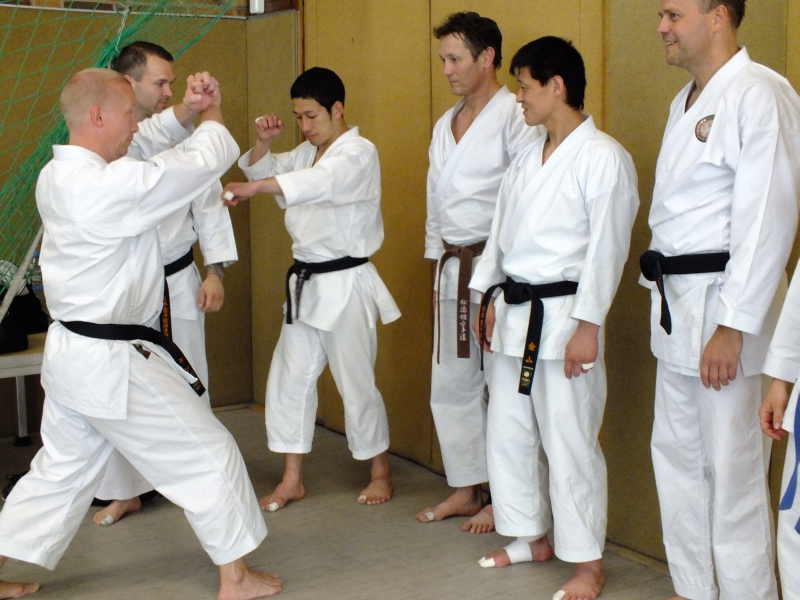 Die Halle war sehr voll. Neben Sensei Kagawa, Cheftrainer der JKS, waren auch Kanayama Sensei sowie der der amtierende Weltmeister Nagaki anwesend. Karateka aus ganz Europa waren angereist um bei den bekanntesten Meistern zu trainieren.