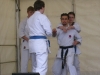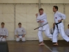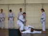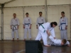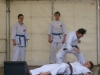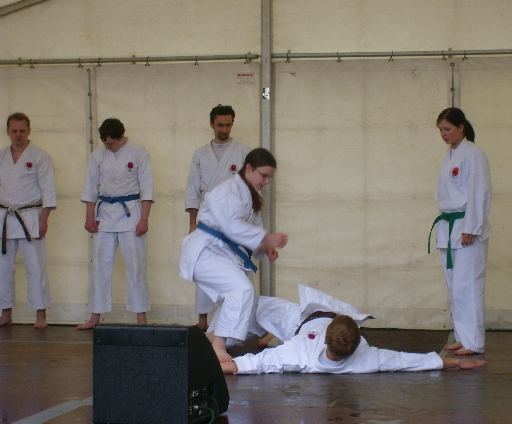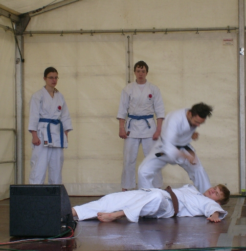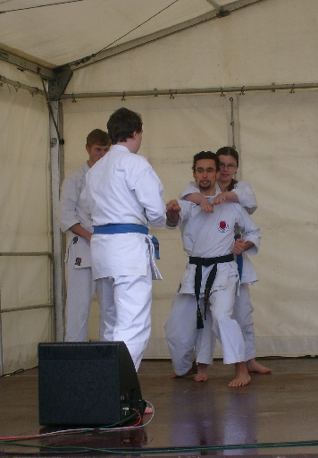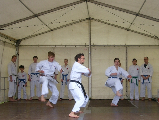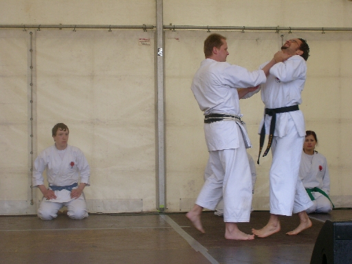 Nach circa einer halben Stunde wurde nun das Zepter wieder an uns übergeben. Thema war nun der wahrscheinlich praktischste Aspekt, die Selbstverteidigung. Nach einer Einleitung begann die Kata Hangetsu. Zuerst die reine Kata, dann die Kata und ihre Anwendung parallel. In der Anwendung mussten drei Angreifer erfolgreich abgewehrt werden. Danach wurde der erste reine Selbstverteidigungsteil gezeigt. Hierbei wurden vor allem Applikationen und bekannte Kombinationen aus dem Training vorgeführt, so dass der Angreifer einige Male wohl im Ernstfall nicht sogleich wieder hätte aufstehen können. Den Abschluss bildete dann eine Demonstration von Marco und Ralph, die Kumite in perfekter Kontrolle boten. Hierbei variierten sie sowohl die Angriffe, Block- und Kontertechniken, als auch die Geschwindigkeit der Techniken, so dass das Publikum eine eindrucksvolle Show zu sehen bekam.