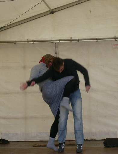 Unser letzter Teil der Vorführung wurde nur noch von 2 Teilnehmern dargeboten. Eine passende Einleitung hatte Ralph schon auf die Musik aufgesprochen: „Meine Damen und Herren, bitte nicht eingreifen!“. Dieser Programmpunkt stand unter dem Motto „Just for Fun“. Oma Elfriede hatte nach 9 Jahren wieder ihren ersten Auftritt. Jedoch konnte der übliche Ganove Marco nicht antreten, so dass Eric die Rolle des finsteren Handtaschendiebes übernahm. Ausgehend von normalen Situationen wurde Oma Elfriede mehrmals tätlich angegriffen, und konnte genauso oft, teils sehr schnell, teils spektakulär, den Angreifer in die Flucht schlagen. Mit dieser Show endeten unsere Vorführung gegen 16.30 Uhr. Alle Mitglieder, die noch nicht den Verlockungen des Frühlingsfestes erlegen waren, machten nun daran, das Fest zu erkunden. Trotz unangenehmen Wetter ernteten die Vorführungen viel Beifall und den Teilnehmern bereiteten sie viel Freude. Ein guter Lohn für die vielen Stunden des Übens und der Vorbereitung für alle.