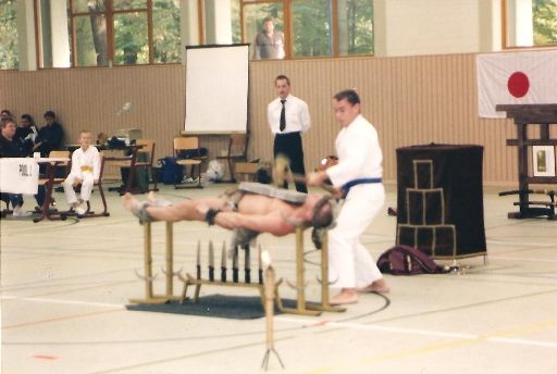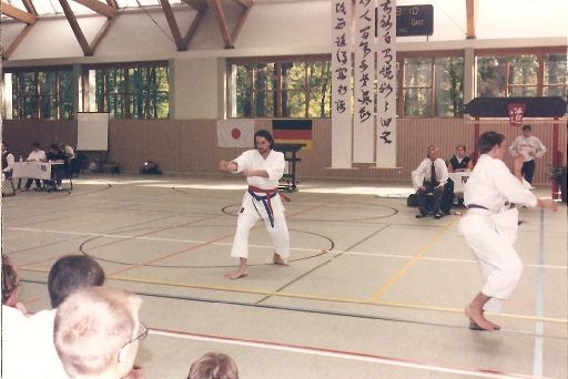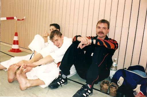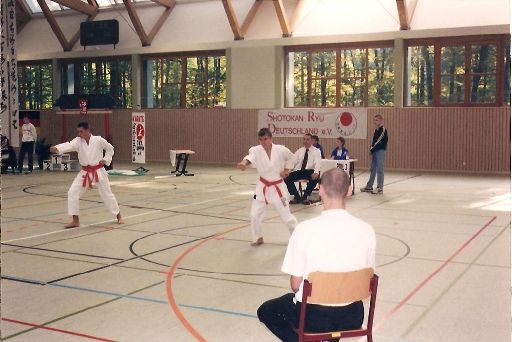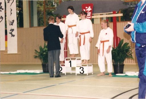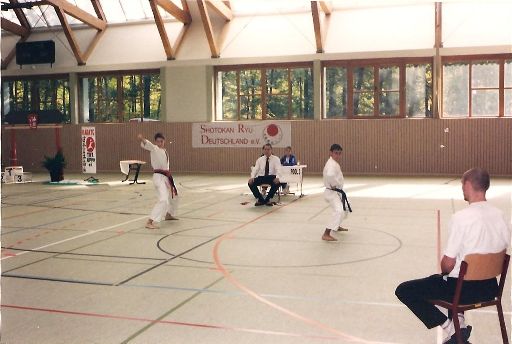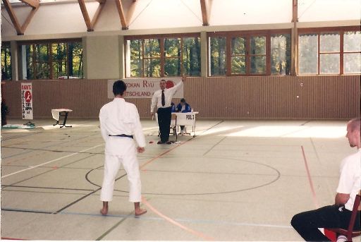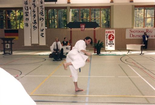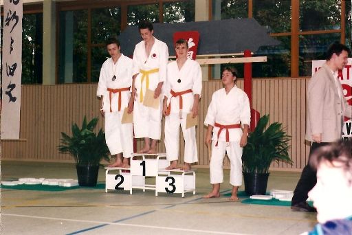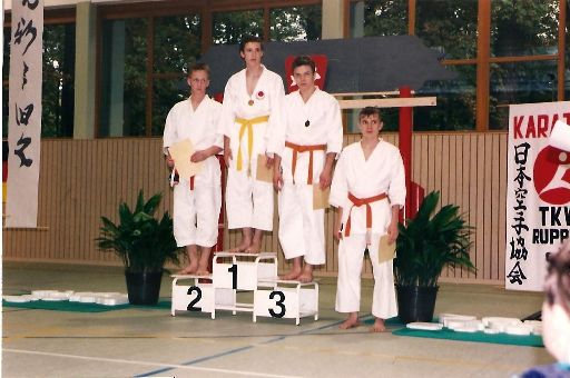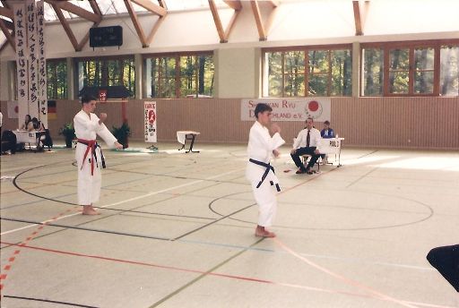 Thomas wiederum wich nach dem erfolgten Angriff so schnell zurück, daß der Gegner selten eine Chance hatte nachzusetzen – einer rutschte sogar bei dem Versuch Thomas doch noch zu erreichen aus. Als Thomas und Marco dann im Finale aufeinandertrafen, war bei Marco leider der ganze Kampfgeist aus den Vorrunden weg. Entsprechend konnte er natürlich auch gegen Thomas nicht bestehen und verlor den Kampf sehr deutlich. Damit kam Marco nur auf Platz zwei im Kumite. Anders in der Kategorie Kata. Hier erkämpfte Marco souverän einen ersten Platz, während Thomas der schon in den ersten Runden auf Marco traf nur noch Aussichten auf den dritten Platz hatte. Diese Hoffnung zerschlug sich aber, als Thomas seinen Kampf in der Trostrunde verlor. Damit landete er auf dem undankbaren vierten Platz.
