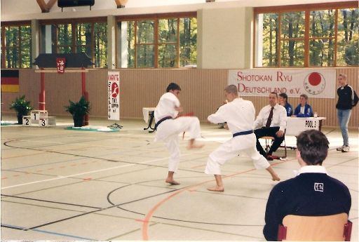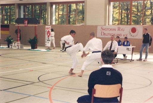 Marco Keßler und Thomas Müller traten in der gleichen Gruppe an. Im Kumite waren beiden ihren Gegnern zu meiner Freude weit überlegen. Kaum kam das Startzeichen, übten sie auch schon durch ihr Vorgehen und ihre Auslagenwechsel so starken Druck auf die Gegner aus, daß diese keine Chance hatten. So gelang es den beiden beispielsweise mehrfach ihre Gegner aus dem Pool herauszudrängen, was diesen natürlich eine Verwarnung einbrachte.