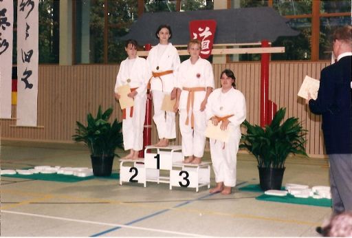 Stefan Schräpel, der gleichfalls in der Kategorie 7. Kyu startete, konnte sich ebenfalls gut durchsetzen. In Kata traf er in der zweiten Runde auf einen Gelbgurt. Nach einem Unentschieden ging es in die nächste Runde. Da der Gelbgurt die Kata Heian Nidan nicht kannte, mußte Stefan nochmals mit Heian Shodan antreten. Meiner Meinung nach hätte er wohl den Sieg verdient, aber die Schiedsrichter entschieden für den Gelbgurt, der allerdings den Gelbgurt, der allerdings im weiteren Verlauf keine Chance mehr hatte, so daß Stefan damit in der Kategorie Kata keine Siegesmöglichkeiten mehr hatte. Etwas anders sah die Sache dann schon beim Kumite aus. Hier bestätigte Stefan seine Leistung von den Meisterschaften im Mai und sicherte sich einen dritten Platz.