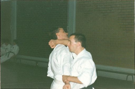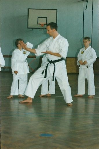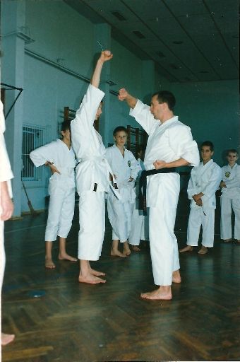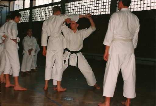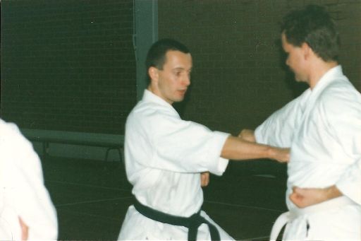 Einen Augenblick aus dem Trainng möchte ich an dieser Stelle herausgreifen, denn ich denke, er ist eine besondere Erwähnung wert. Am Sonntag wurde zum Abschluß des Trainings Mawashi Geri geübt. Alexander Bieche konnte diesen so gut ausführen, daß er von Siggi nach vorn geholt wurde, um ihn auch allen anderen zu zeigen. Bedauerlicherweise konnte ich diesen Moment nicht im Bild festhalten.