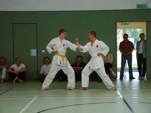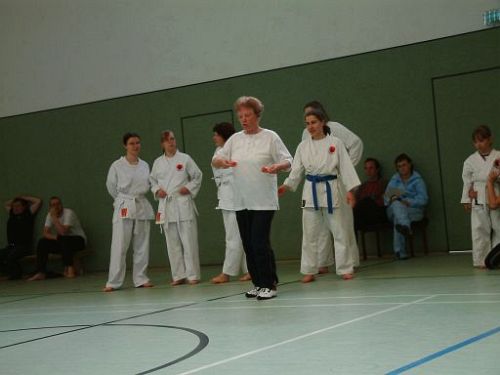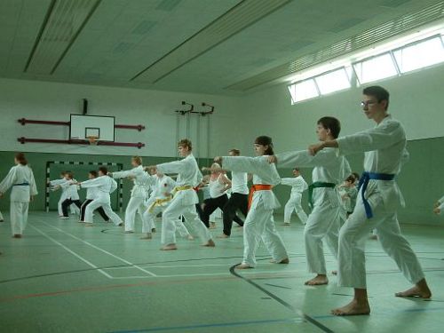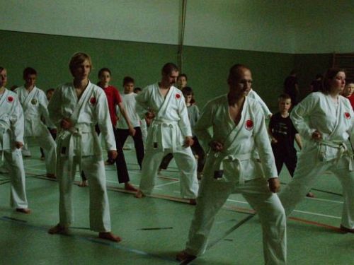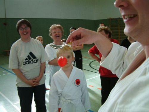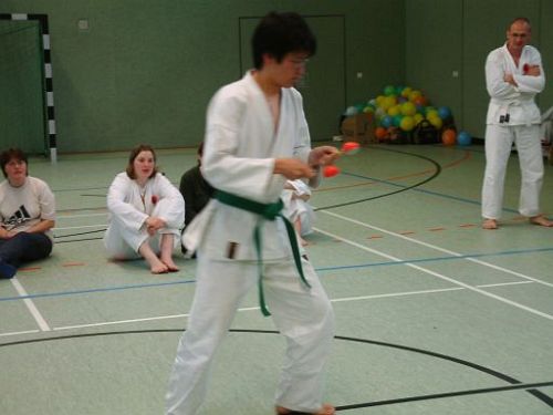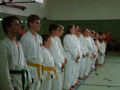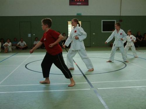Auch ein anderes Ereignis im Verlauf der Prüfung zeigt, dass wir noch viel lernen müssen: Nämlich niemals aufzugeben. Als eine der Teilnehmerinnen in der Kata nicht weiterwusste, verließ sie einfach die Halle. Ein Junge verließ gleichfalls nach der missglückten Kata die Halle. Da die Kata für den Weißgurt nicht Prüfungsvoraussetzung war, hatte dies letztlich auf das Prüfungsergebnis selbst keinen Einfluss. Allerdings sollte dergleichen niemals vorkommen. Einer unserer Erwachsenen verlief sich zwar auch mächtig in der Kata (er endete tatsächlich auf der anderen Seite der Halle, direkt gegenüber seinem Startpunkt), doch er beendete die Kata und gab nicht einfach auf. Aufzugeben heißt immer zu verlieren.