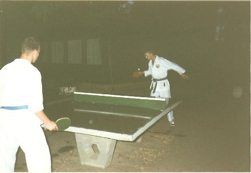 Das erste Training war trotz des Regens gut, aber es hätte noch besser sein können. Wir lernten eine Kata, die wir zur Zeit , jedenfalls für unsere jetzigen Gürtelfarben, noch nicht brauchen. Nach dem Training war wiederum die Tischtennisplatte der Anziehungspunkt, Viele Punkte konnten verteilt werden. Auch wenn es immer dunkler wurde, so daß man kaum noch die Hand vor den Augen sah, wurde weitergespielt. Erst als wir wirklich nichts mehr erkennen konnten, begaben wir uns zur Nachtruhe.