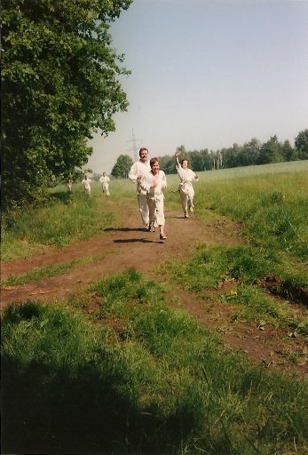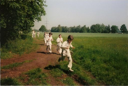 Aber da man sich ja nicht zu lange ausruhen soll, um nicht aus der Form zu kommen, ging es bereits nach 45 Minuten wieder hinaus. Diesmal aber nur hinter die Turnhalle. Dabei war festzustellen, daß die Zahl der Trainingsteilnehmer etwas geschrumpft war. (Vielleicht war das Training ja ein wenig zu anstrengend?)