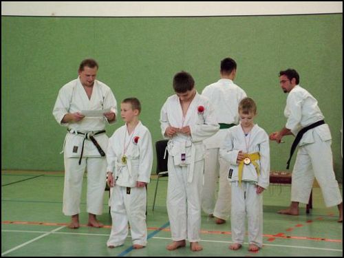 In den unteren Kategorien hatten wir erfreulicherweise 4 Seitenkampfrichter, so dass die Wertungen gerechter ausfallen konnten. Erstmals zum Einsatz kamen unsere neuen Kata-Wertungstafeln, die eigentlich noch ganz druckfrisch waren, denn Ralph hatte sie gerade einmal 1 Stunde vor der Veranstaltung abgeholt.