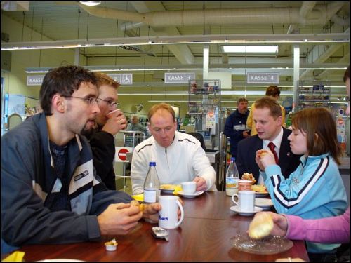 Vor einer Woche waren wir zu spät gekommen und hatten deshalb unsere Vorführung verpasst. Heute hatte der stellvertretende Direktor offenbar ein kleines Problem übersehen, denn er hatte die Vorführung auf einen Tag gelegt, der überhaupt nicht frei war. Als wir zur Halle kamen wunderten wir uns schon über den großen Andrang rings um die Halle. Dann erfuhren wir auch den Grund: Heute war ein Volleyballturnier zwischen verschiedenen Gymnasium. Außerdem fand ein Aktionstag statt. Daher mussten wir unverrichteter Dinge wieder abfahren nachdem Richard einen neuen Vorführungstermin für die kommende Woche vereinbart hatte.