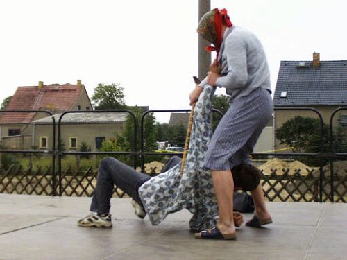 Jetzt hieß es aber ab zum Festplatz! Dort eingetroffen stellten wir fest, dass die Musik noch voll im Gange war. Wir wurden uns schnell einig – im Festzelt sollte die Vorführung ganz sicher nicht stattfinden, dann lieber draußen auf der Bühne, wenngleich wir hier unter Umständen mit Platzproblemen zu kämpfen haben würden. Nun ja – siebzehn Uhr sollte die Vorführungbeginnen, aber die Musikkapelle spielte unverdrossen, so dass wir dann erst eine halbe Stunde später anfangen sollten (war mir auch ganz lieb). Allein die Musikanlage bereitete uns arge Probleme. Ein alter Lautsprecher mit Verstärker fand sich noch recht schnell – auch ein CD-Player, aber wir brauchten doch eine Kassetten-Abspielgerät! Zum Glück hatte ich ja mein Gerät dabei, doch welch Pech – die Anschlüsse passten nicht. Da machte sich der freundliche „Elektroniker“ auf den Weg und brachte schließlich einen alten Kassetten-Rekorder mit (übrigens zu DDR-Zeiten ein sehr gutes Gerät), doch dieser wieder wollte nicht so einfach aufgehen und die Kassette aufnehmen – war er doch schon für die nächste Sperrmüll-Aktion vorgemerkt gewesen. Glücklicherweise aber konnte das Gerät dann doch noch in Gang gesetzt werden und dann ging es los.