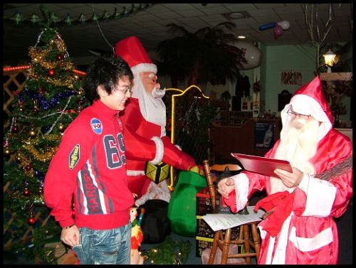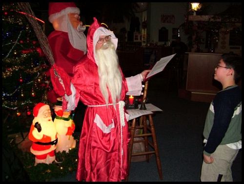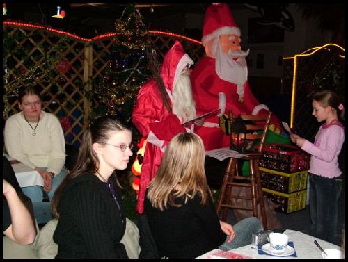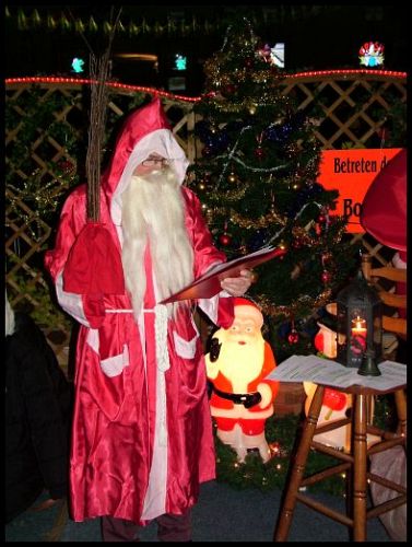 Da sich der Bürgermeister ein wenig verspätete kam zunächst der Weihnachtsmann an die Reihe, der erstaunlich gut über alles informiert war. Aber offenbar hatten seine Zuträger nicht ganz sauber gearbeitet, denn einige der Angaben waren nicht zutreffend – aber das wusste der Weihnachtsmann auch. Wenngleich oft der Vermerk „Rute benutzen“ auftauchte, so genügte doch eine Drohung mit derselben, da die meisten dann doch Besserung gelobten.