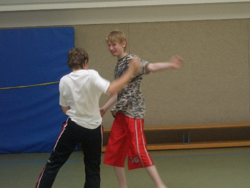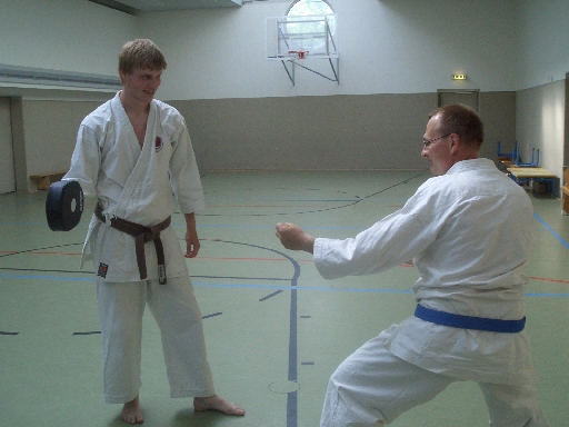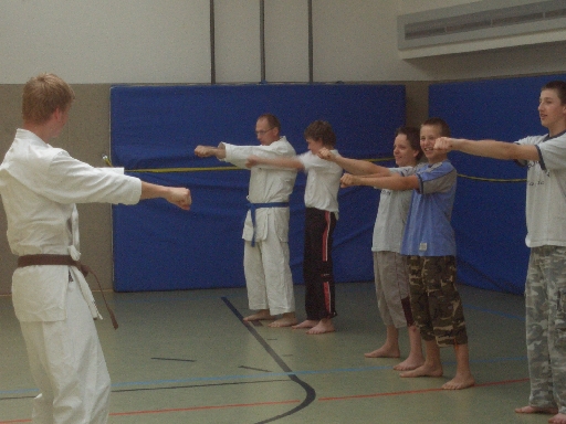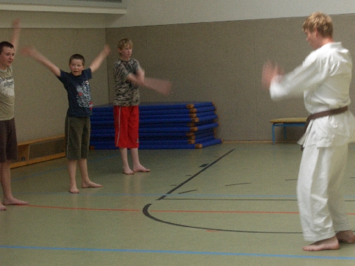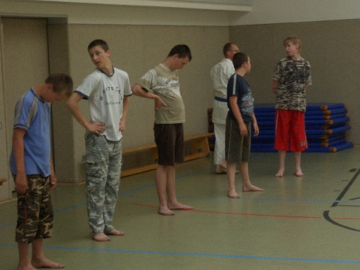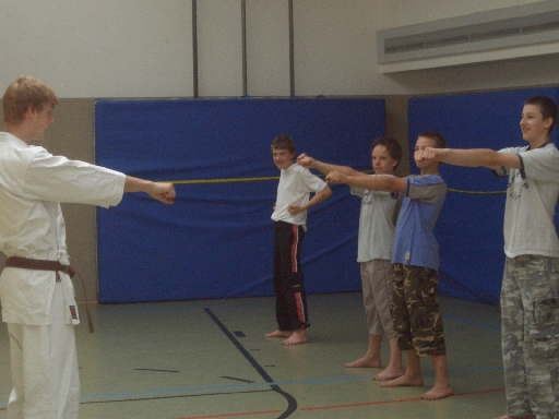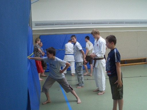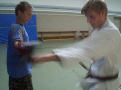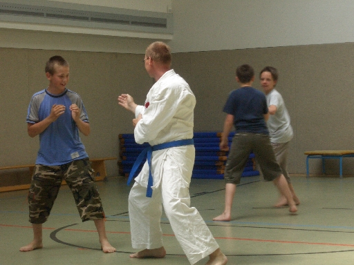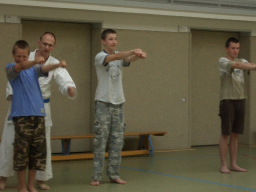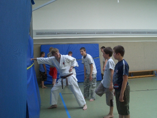Den zweiten Trainingstag bildete der Mittwoch. Trotzdem die Jungen noch am Abend eine Radtour gemacht hatten, standen alle pünktlich in der Halle. Schwerpunkte für diesen Tag waren die Partnerübung und das Erlernen einer Abwehr für den Kopf. Begonnen wurde, wie am Vortag, mit einer Begrüßung und der Aufwärmung, gefolgt von der Wiederholung der Karateelemente. Dann ging es an den Partner. Als Form hatten wir Kihon-Ippon-Kumite ohne Konter und nur geradem Zurückweichen gewählt. Hier bemerkten wir, dass die Jungendlichen mit dem größten Mundwerk, doch deutliche Probleme mit einigen Techniken hatten. Nach einigen Erklärungen und ein paar Wiederholungen saß jedoch bei jedem die Übung. Nun kam ein neuer Block. Es sollte Jodan-Juji-Uke sein. Innerhalb kürzester Zeit war die Abwehr einsatzbereit, sodass auch sie im Kumite praktischen Nutzen zeigte. Letzte Technik stellte Tettsui-Uchi dar, der besonders verdeutlichte, dass ein Angriff auch eine Abwehr sein kann.