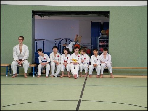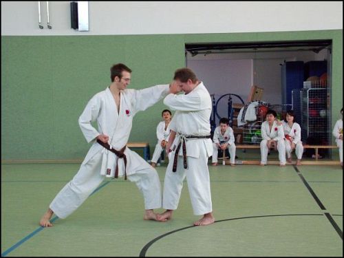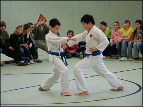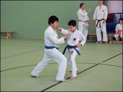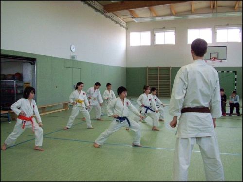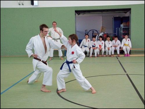 Wie immer bestand die Vorführung aus Grundschule, Kumite und Kata. Ralph erklärte und beantwortete Fragen, die im Anschluss an die Vorführungen zunächst nur zögerlich, dann aber, nachdem das Eis gebrochen war, teilweise nur so hervorsprudelten…
