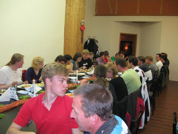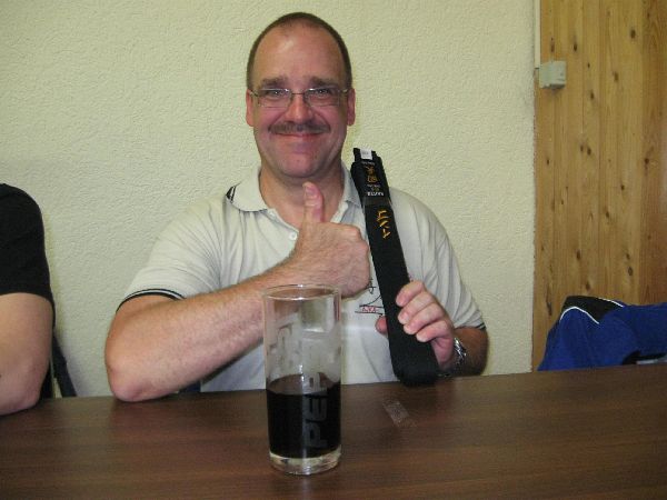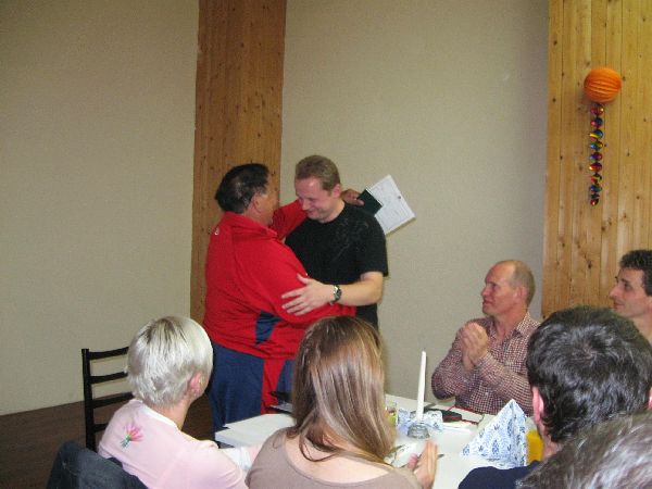 Über die Prüfungen am Nachmittag (1x 3. Kyu, 4x 2. Kyu, 1x 1. Kyu, 3x 1. Dan, 1x 2. Dan, 1x 3. Dan und 1x 4. Dan) äußerte sich Safar Sensei sehr zufrieden. Alle Prüflinge hatten mit guten Leistungen geglänzt. Am Abend kamen wir alle beim Griechen zusammen. Mit knapp 60 Leuten bei der Lehrgangsparty war diese extrem gut besucht. Mit Freude und Stolz verkündete Safar Sensei vor dem gemeinsamen Abendessen die Prüfungsergebnisse vom Nachmittag.